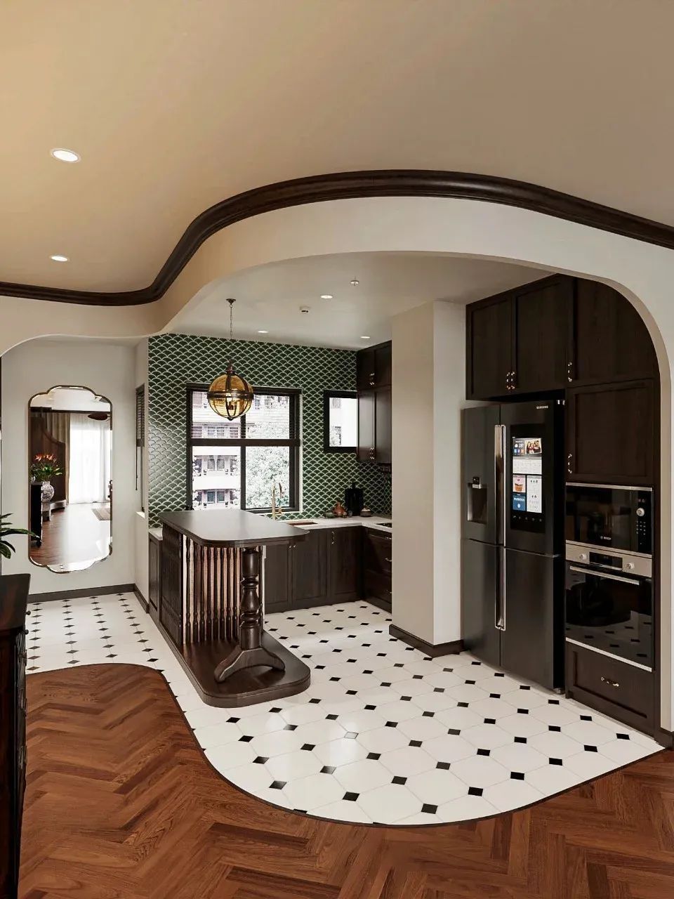 开放式厨房采用拱形门洞作为隔断,不仅让空间线条更加柔和,还使得整个厨房和餐厅区域看起来更加宽敞通透。